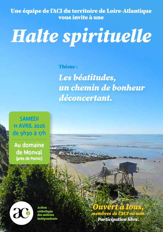 Une Ă©quipe de lâAction CathoÂlique des milieux IndĂ©ÂpenÂdants (ACI) du terÂriÂtoire de Loire-AtlanÂtique vous invite Ă vivre une jourÂnĂ©e de halte spiÂriÂtuelle, ouverte Ă tous.